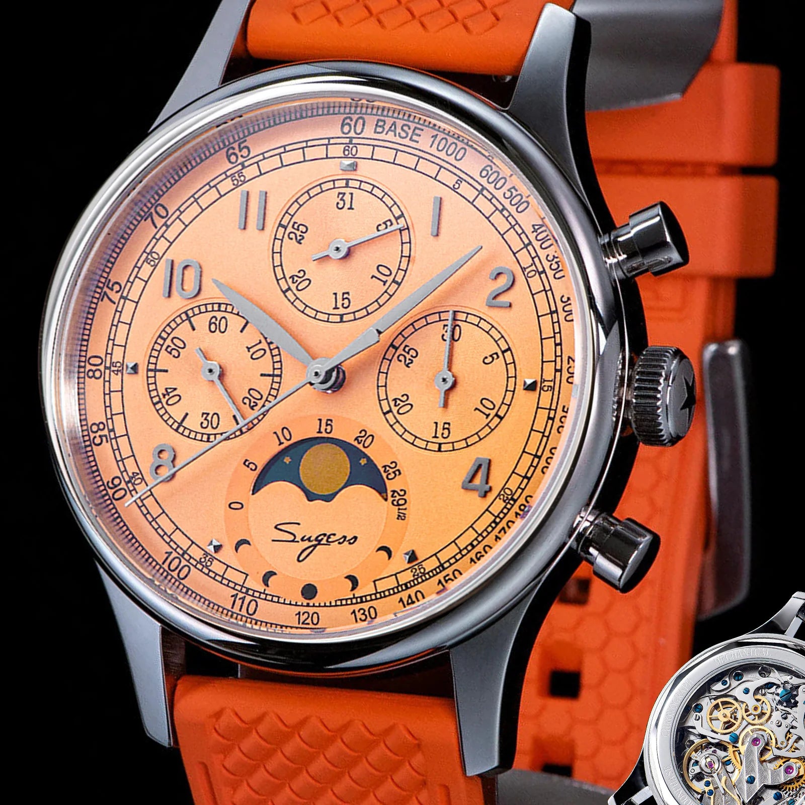 • Features : Column Wheel Chronograph, 59 teeth gear for 29 ½ Days MoonPhase, Exhibition Case Back Cover, Gold Swan Neck Regulator
