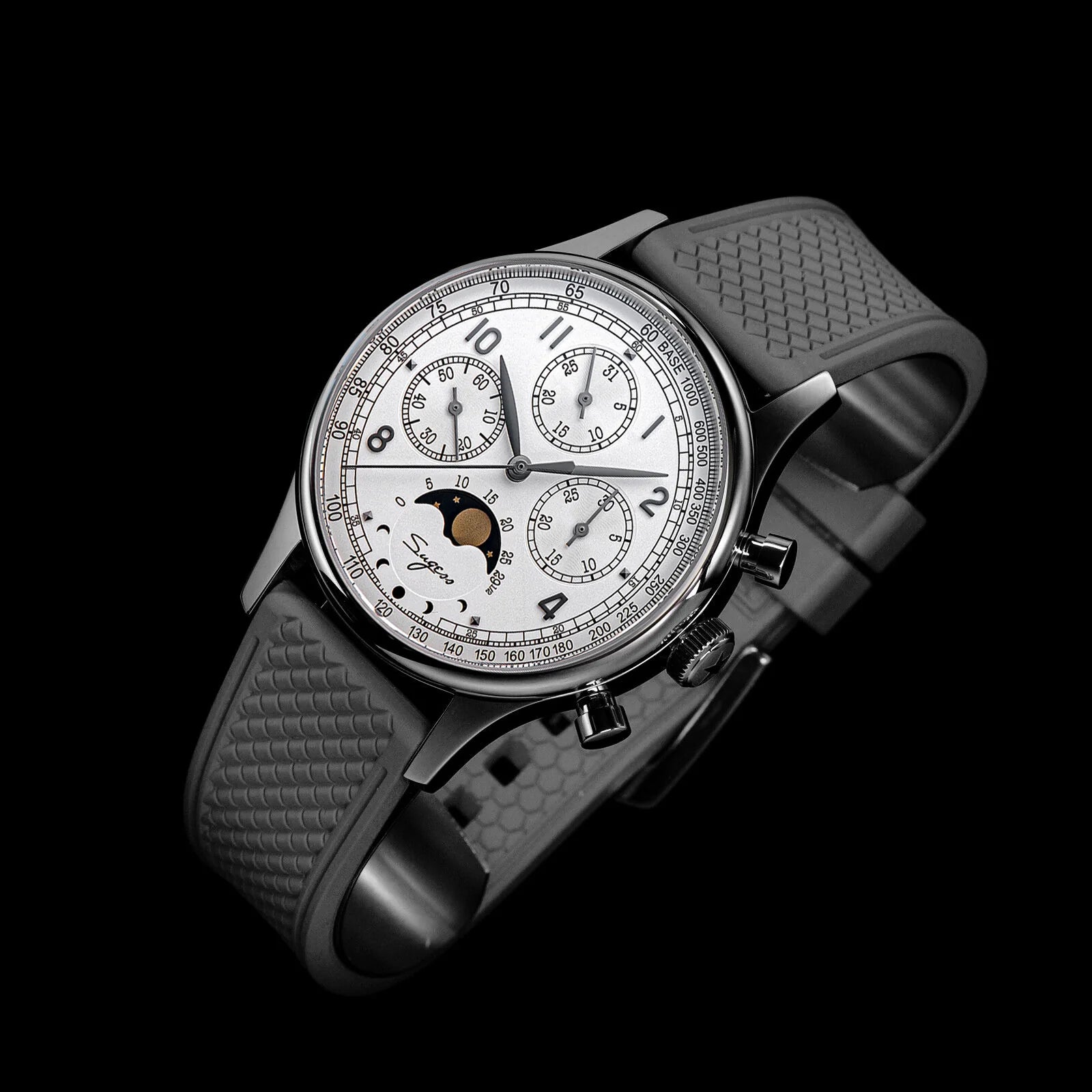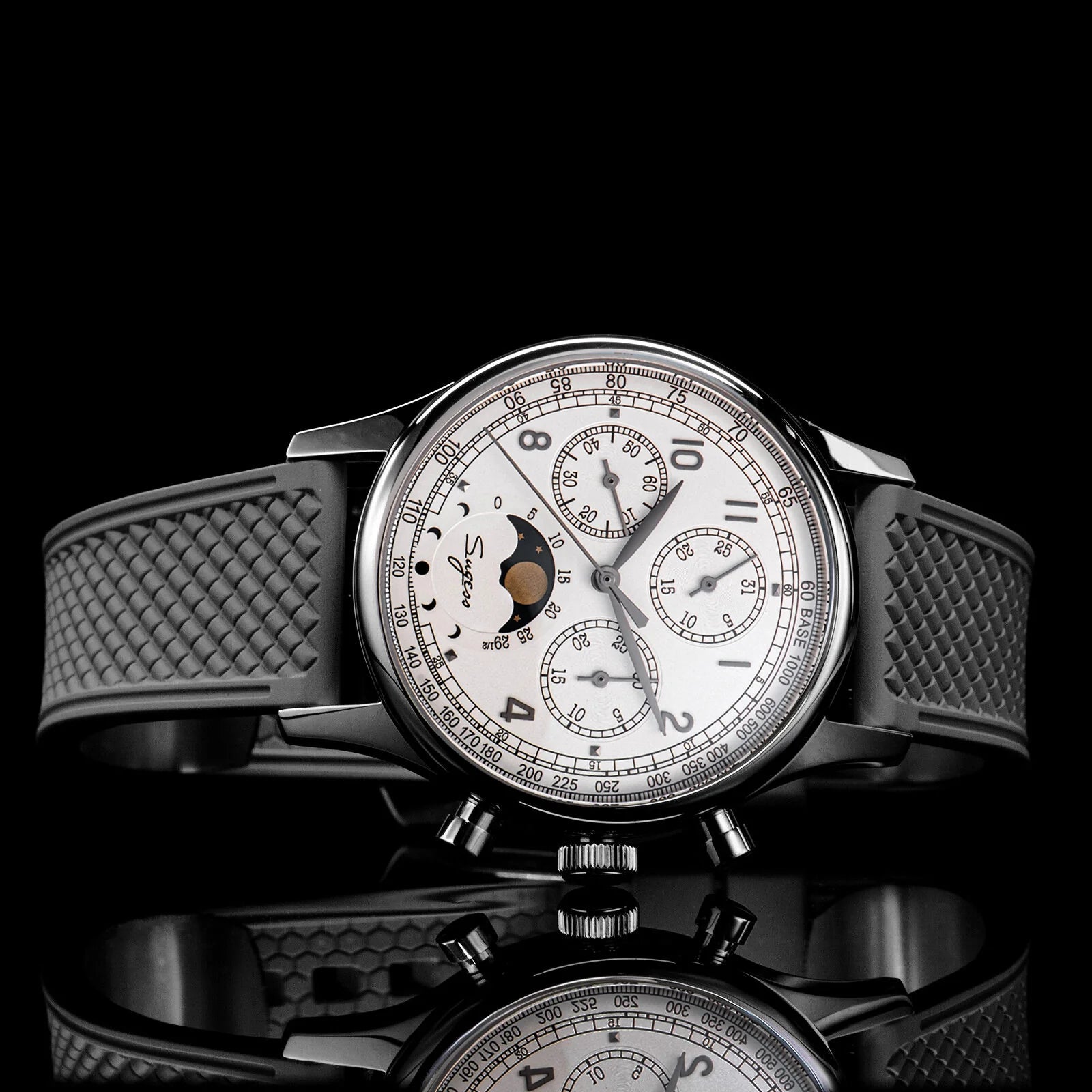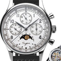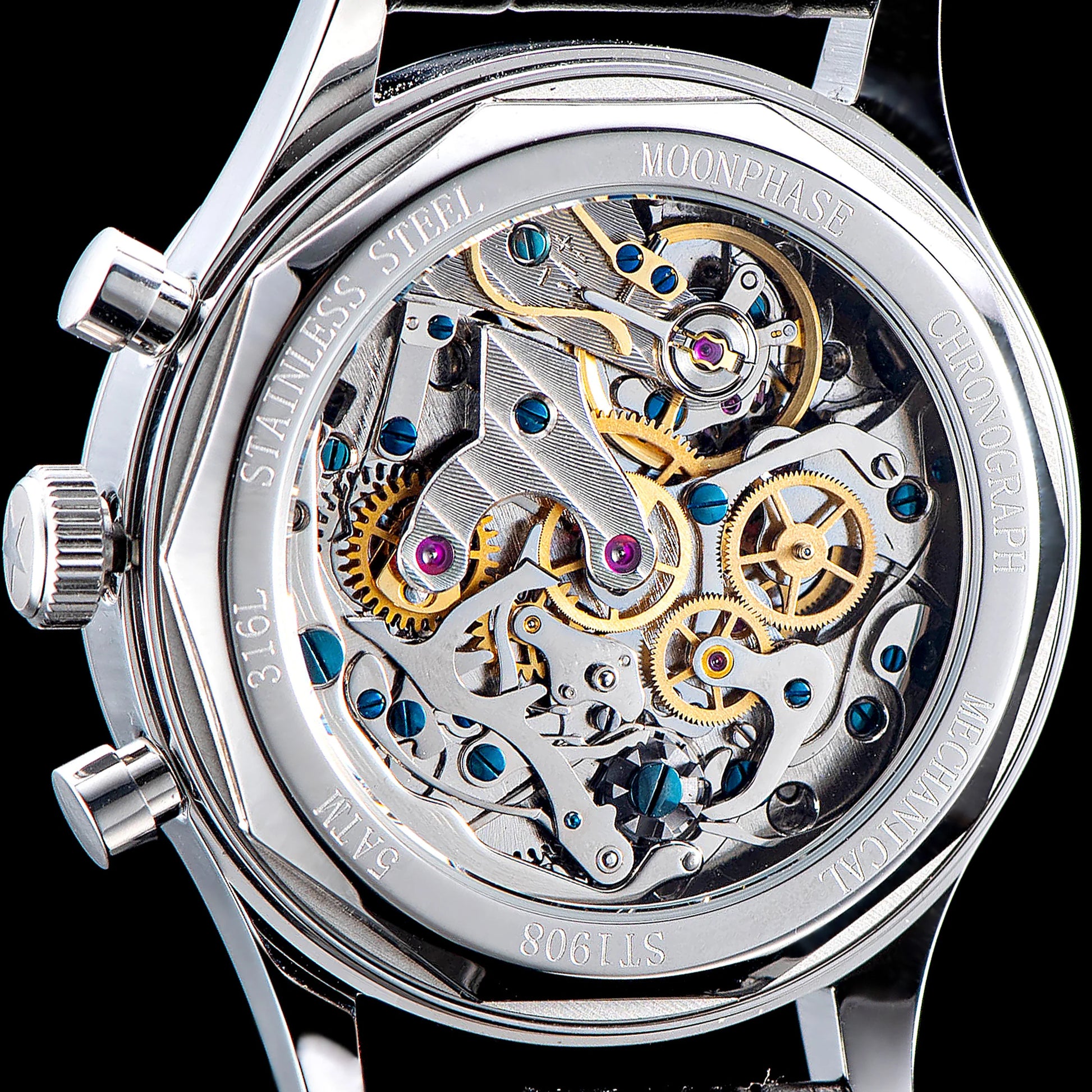 • Features : Column Wheel Chronograph, 59 teeth gear for 29 ½ Days MoonPhase, Exhibition Case Back Cover, Gold Swan Neck Regulator