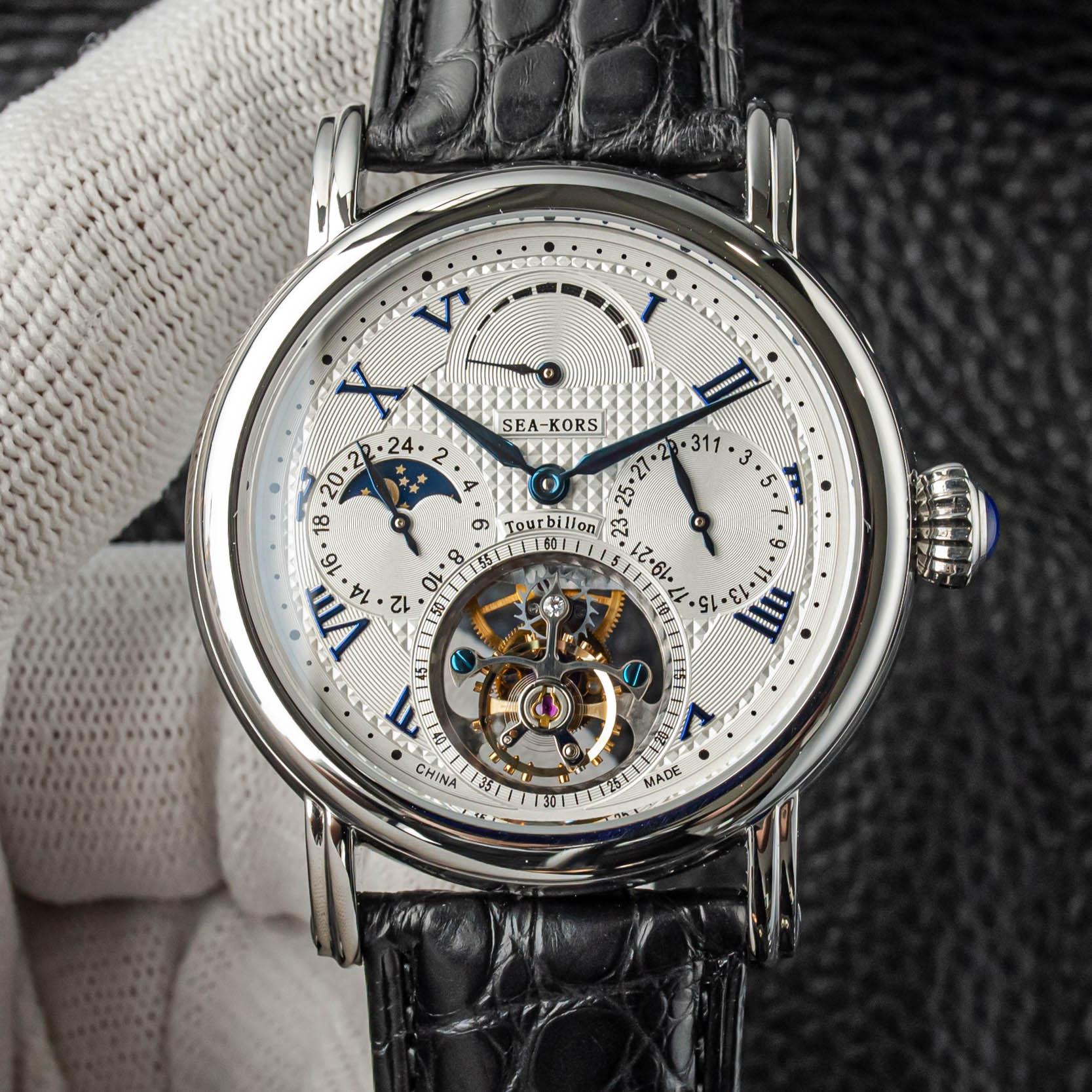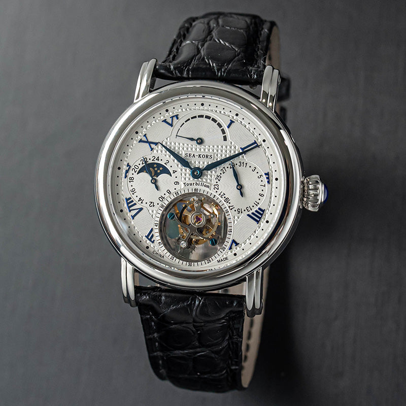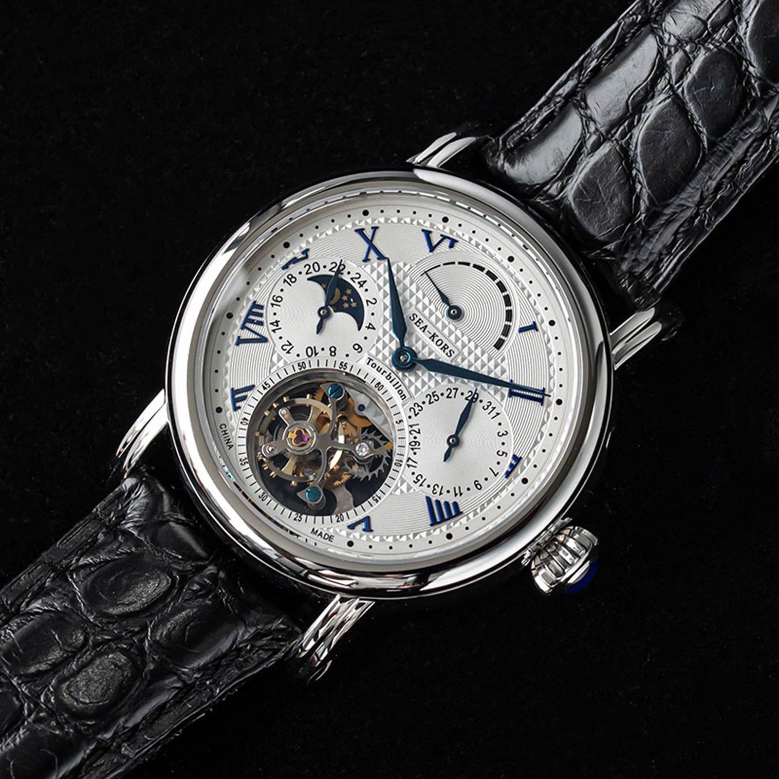 特点:陀飞轮,麦穗表盘,蓝钢指针和螺丝,重量精密摆轮,展示表壳后盖