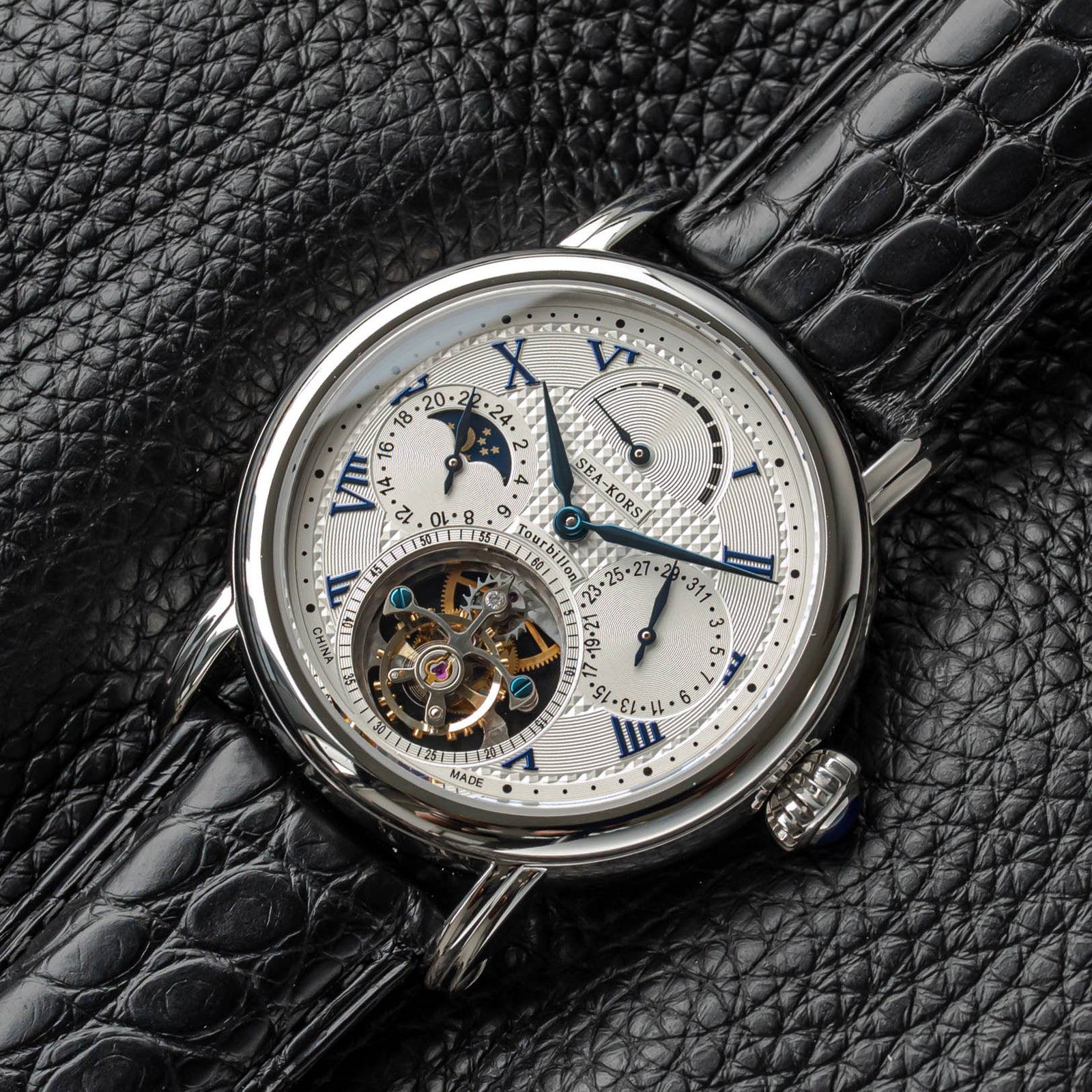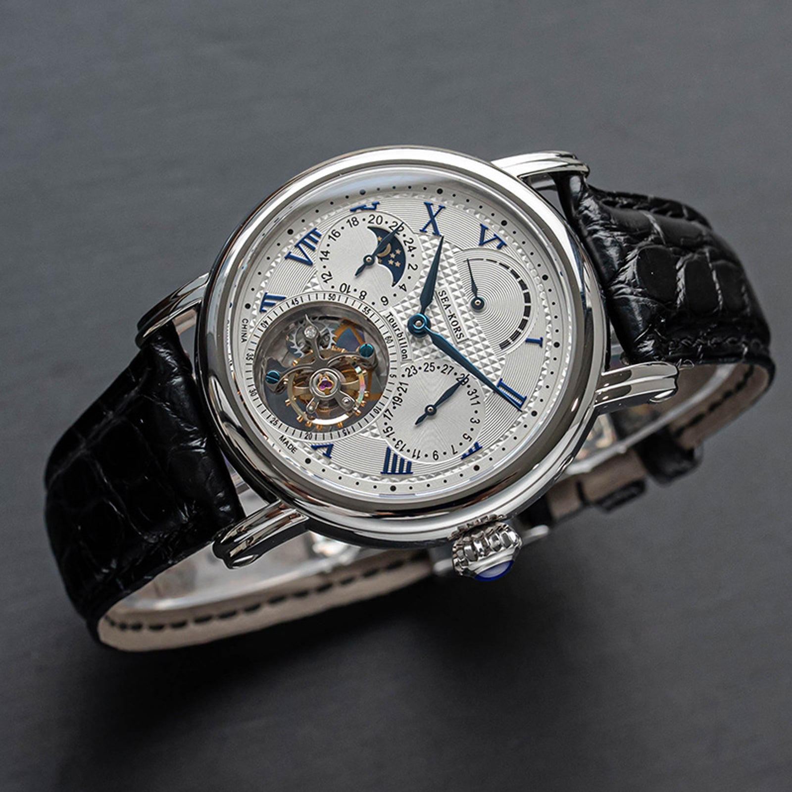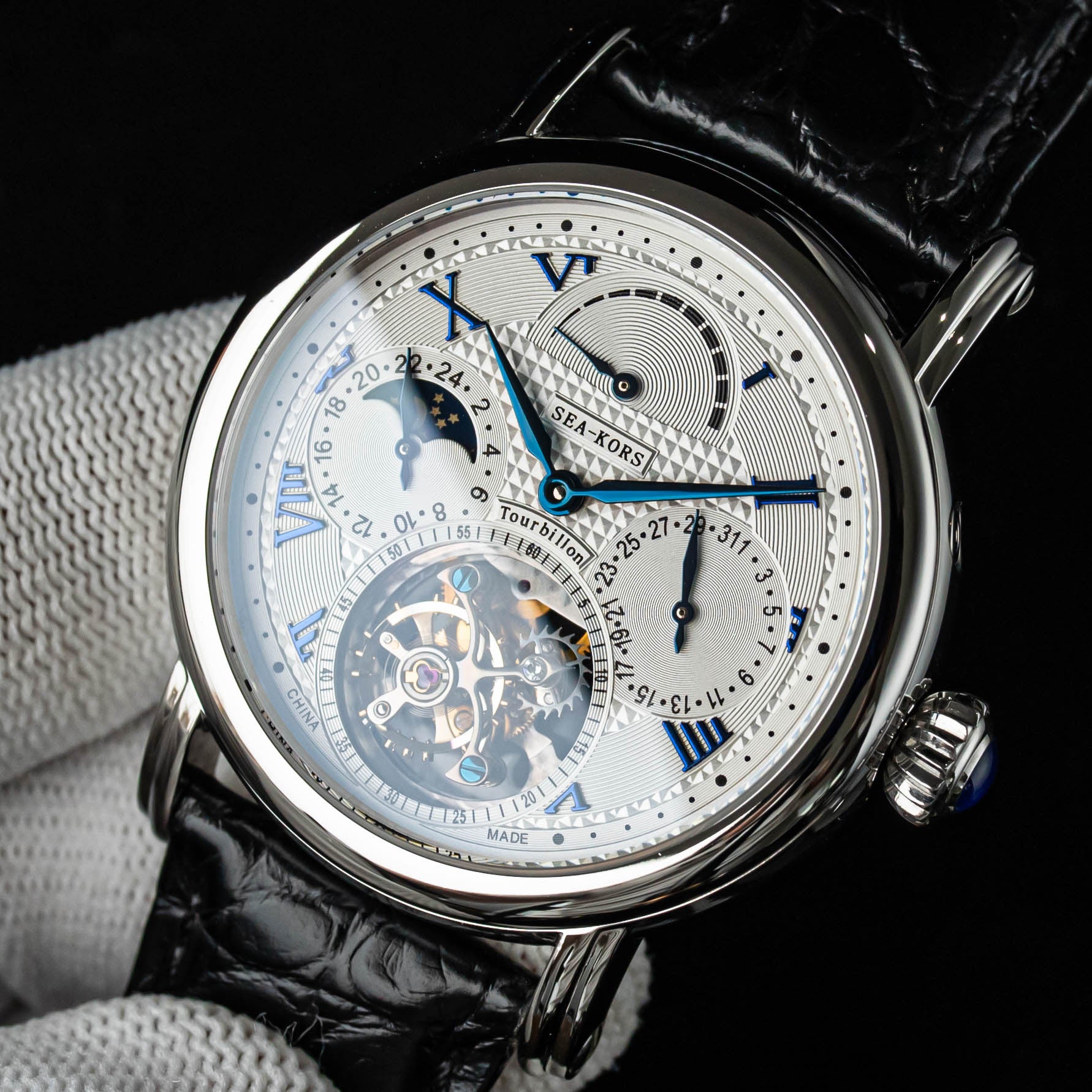 特点:陀飞轮,麦穗表盘,蓝钢指针和螺丝,重量精密摆轮,展示表壳后盖