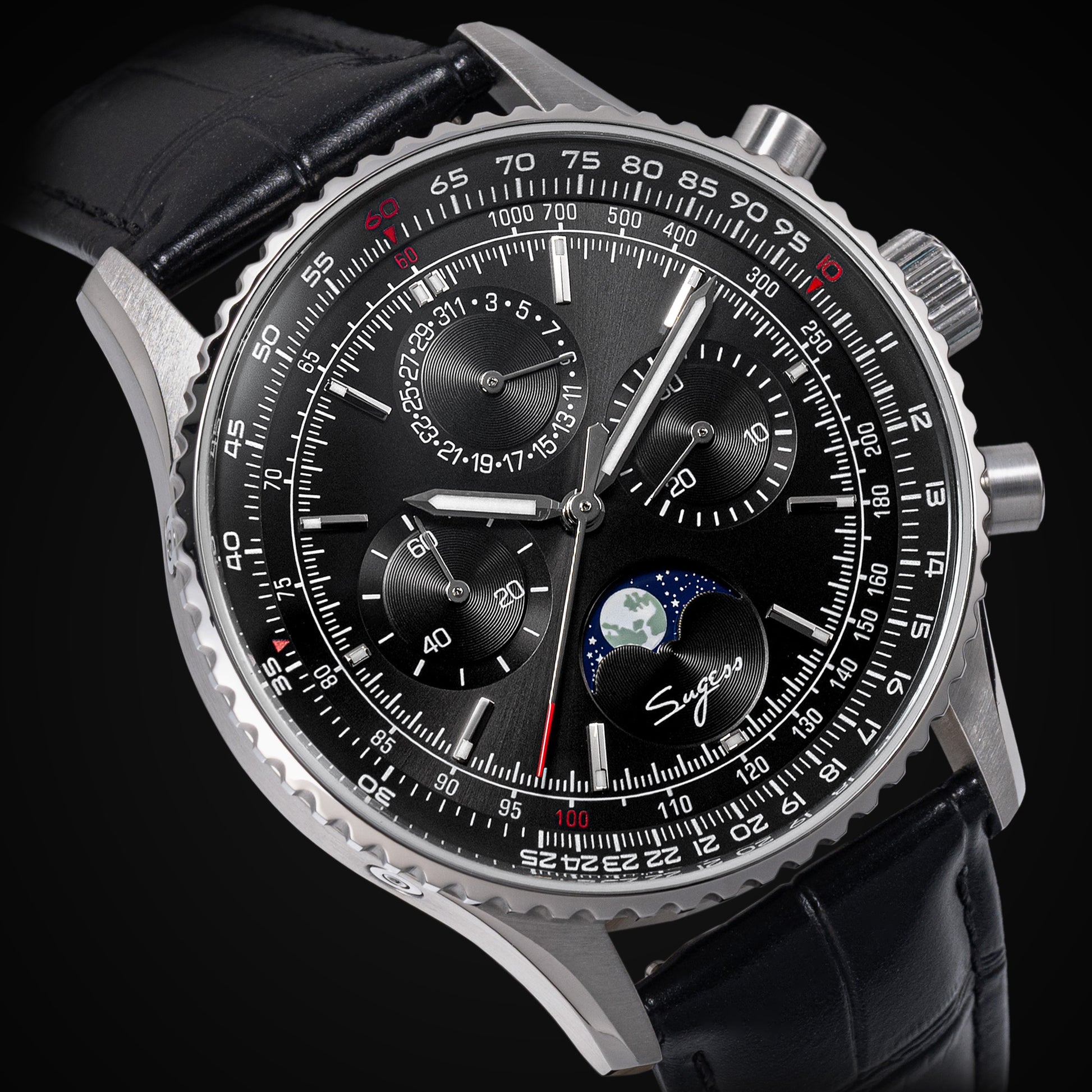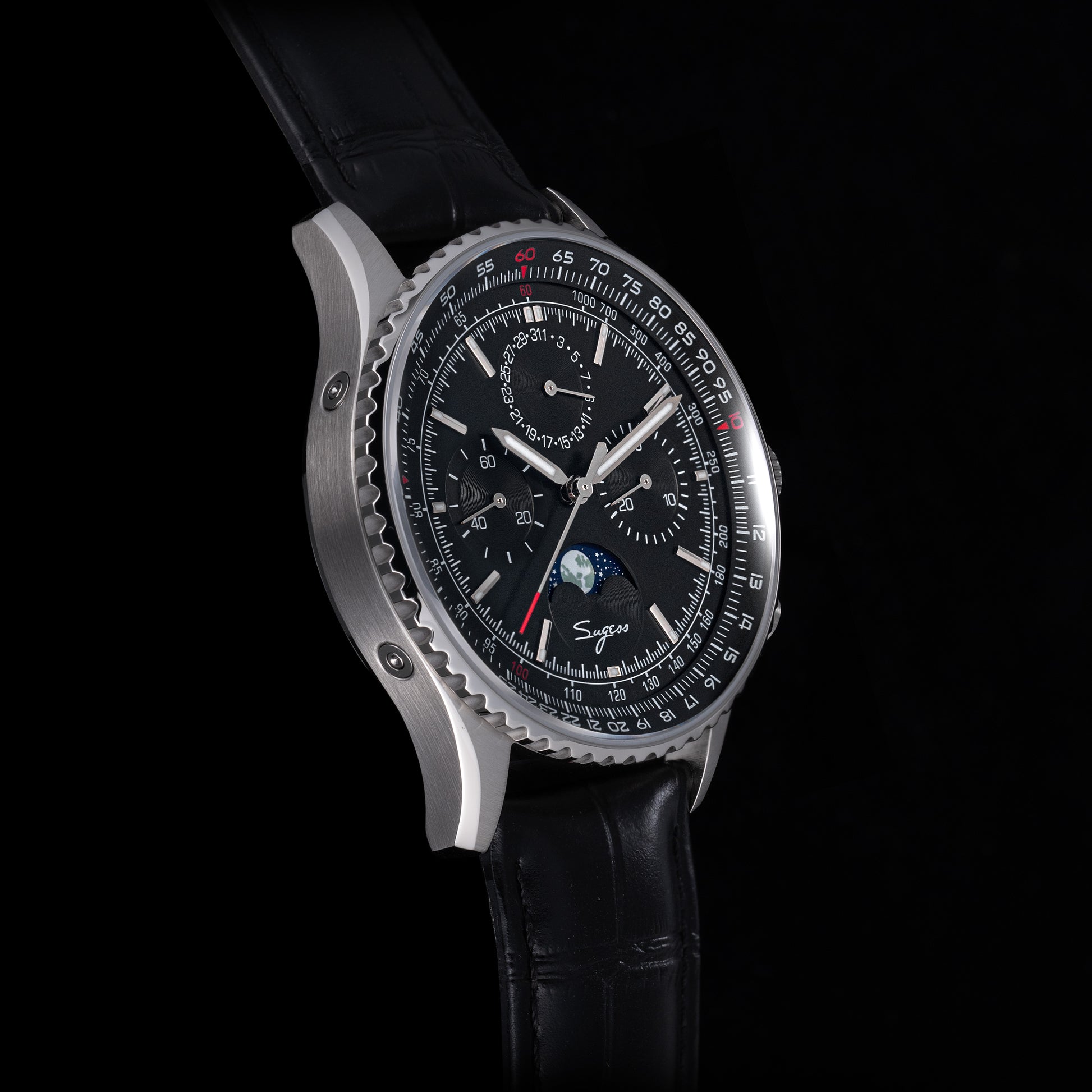 • Features : Column Wheel Chronograph, 59 teeth gear for 29 ½ Days MoonPhase, Exhibition Case Back Cover, Gold Swan Neck Regulator