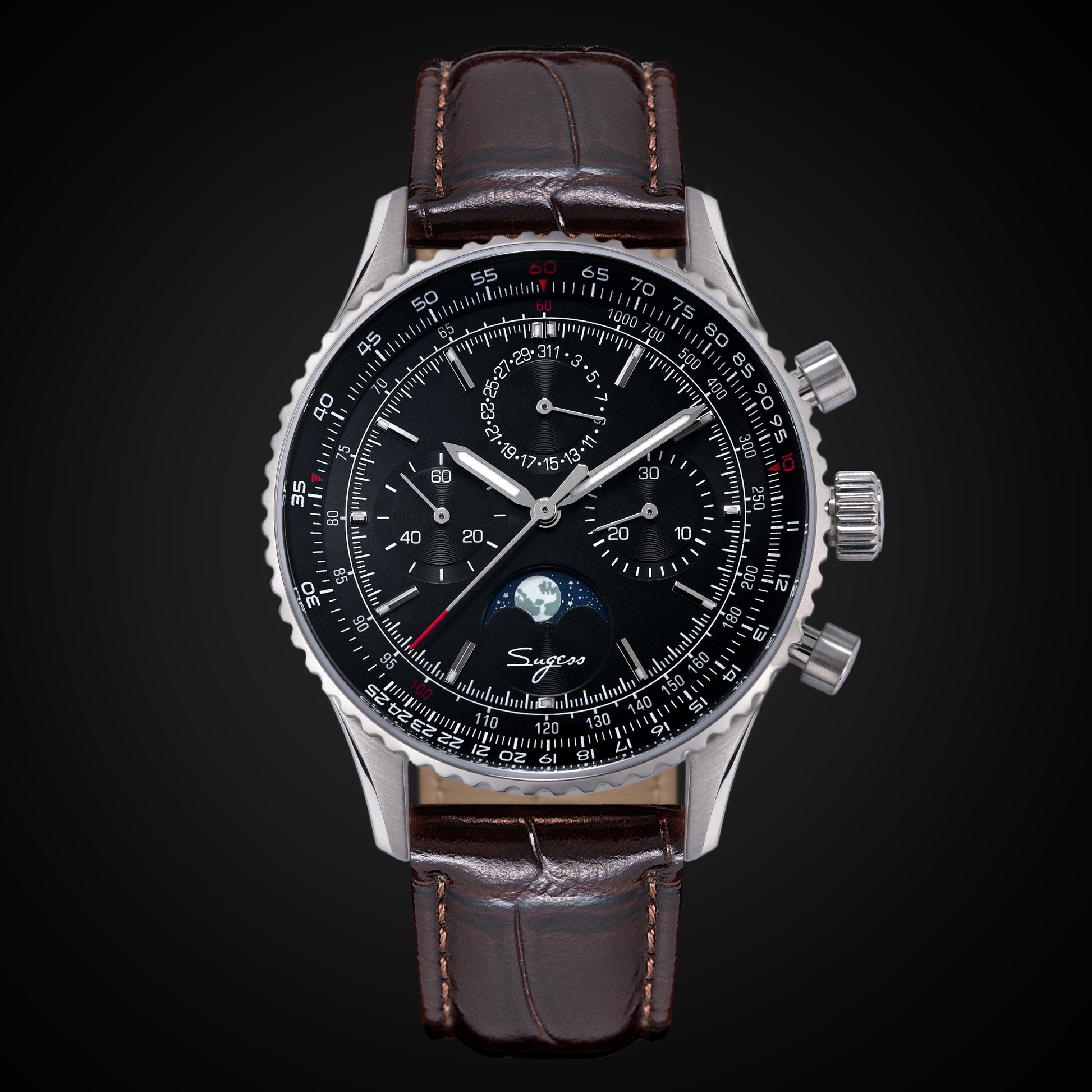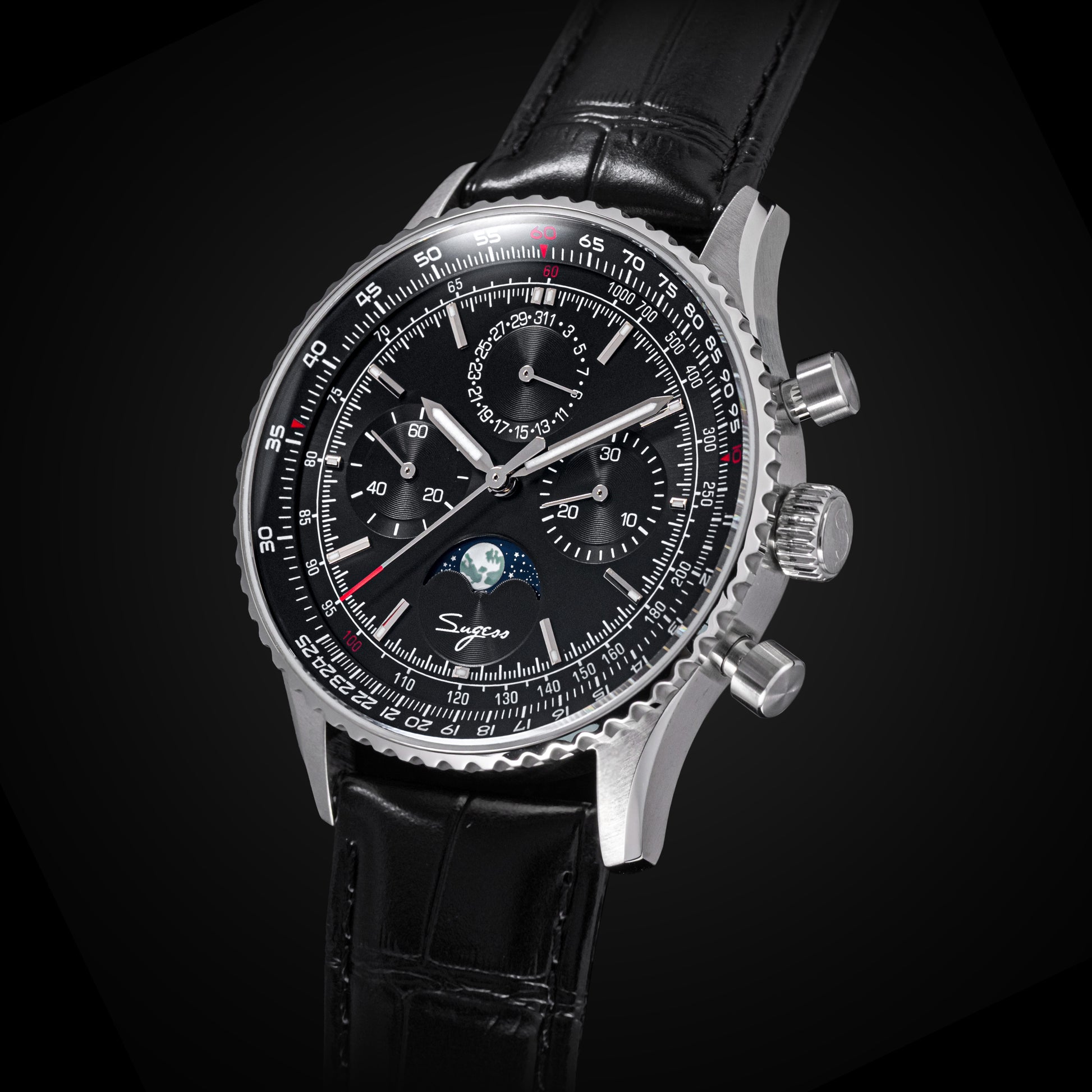 • Functionality : 12 Hours and seconds Indicator, Date Indicator, 29 ½ Days MoonPhase Display, 30 Minutes Chronograph, Tachymeter